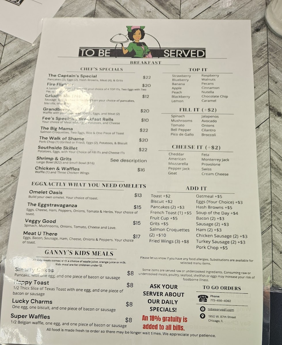 Welcome to To Be Served, a delightful gem nestled in Chicago, where comfort food meets heartfelt hospitality. The moment you step in, you’re greeted by the warm atmosphere and friendly staff, making you feel right at home.